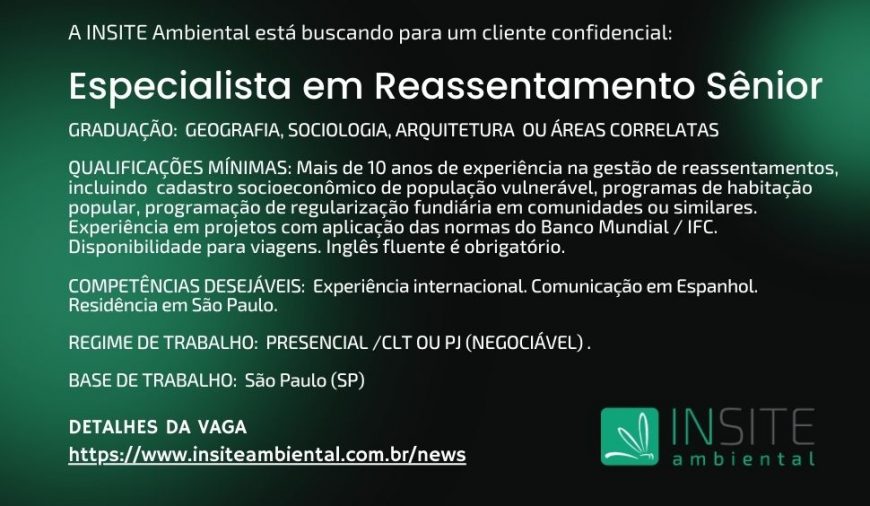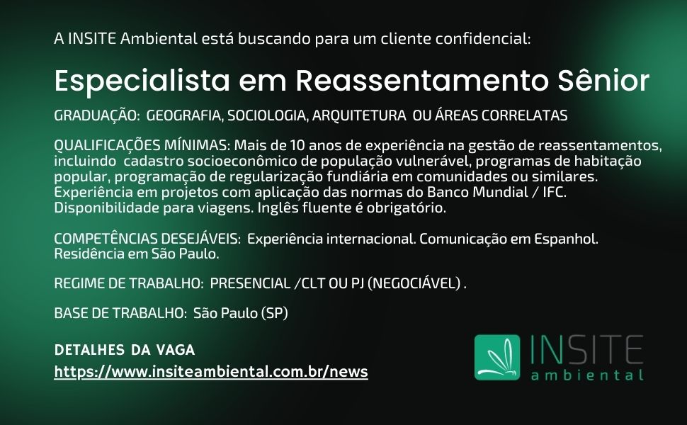 A INSITE Ambiental está buscando para um cliente confidencial um(a) ESPECIALISTA EM REASSENTAMENTO SÊNIOR.