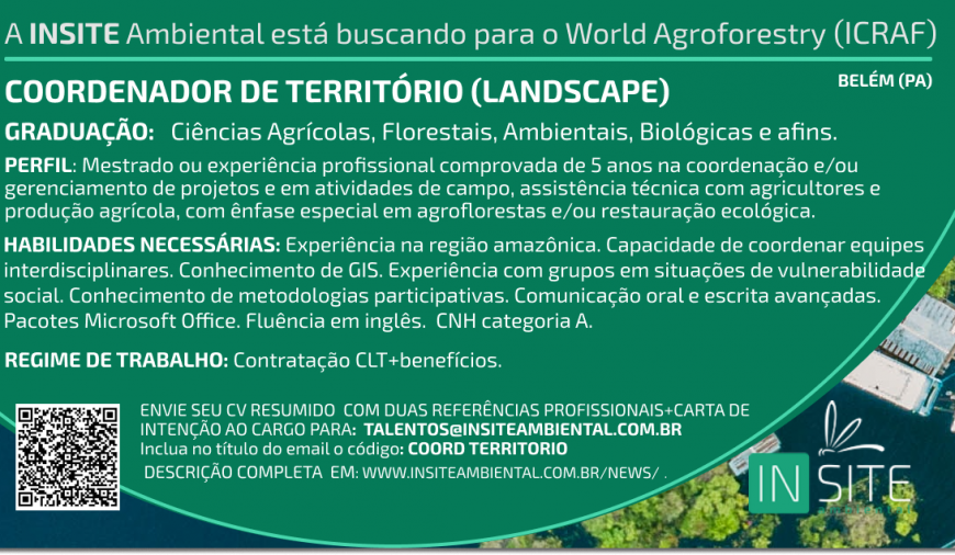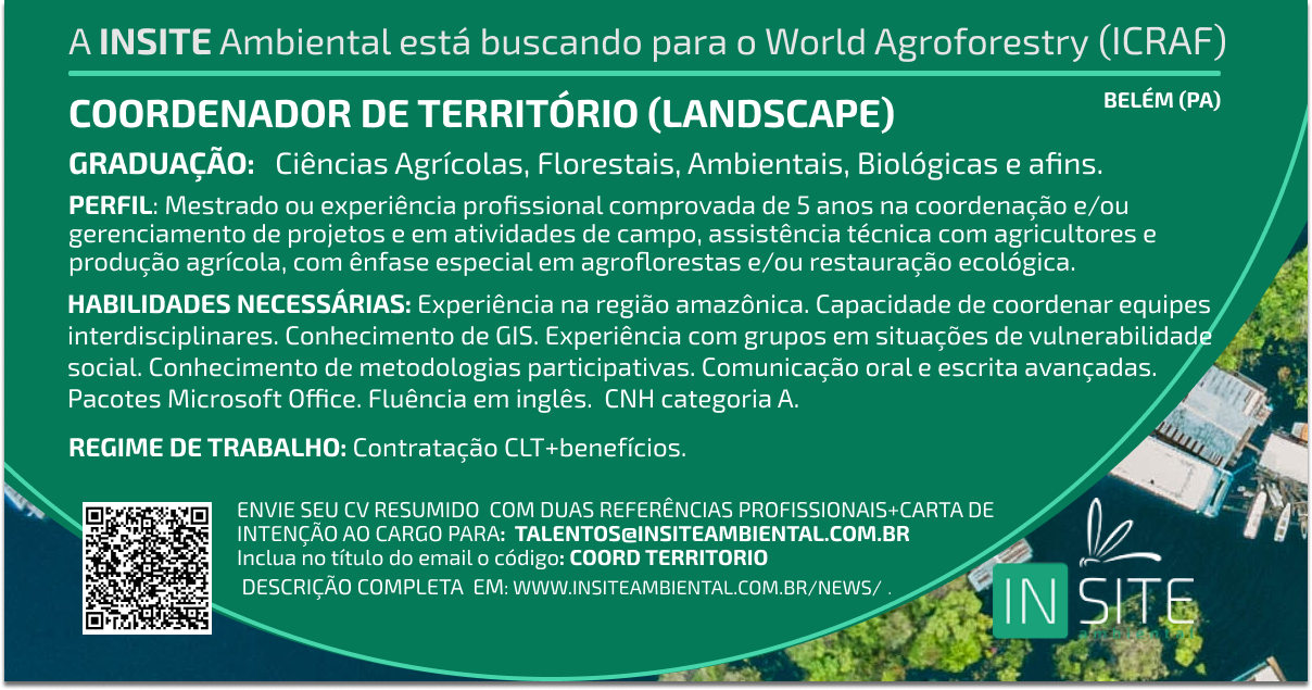 A INSITE Ambiental está buscando para o World Agroforestry (ICRAF): COORDENADOR DE TERRITÓRIO (LANDSCAPE) Apresentação da organização O Centro Internacional de Pesquisa Agroflorestal (World Agroforestry) – ICRAF é um centro internacional de pesquisa referência no desenvolvimento e pesquisa agroflorestal com a missão de gerar conhecimentos com base na ciência sobre os diversos benefícios –…