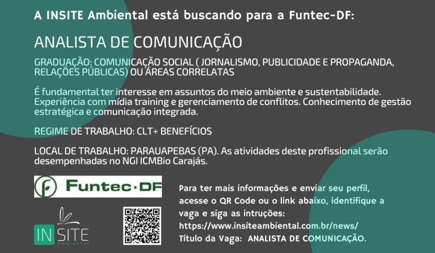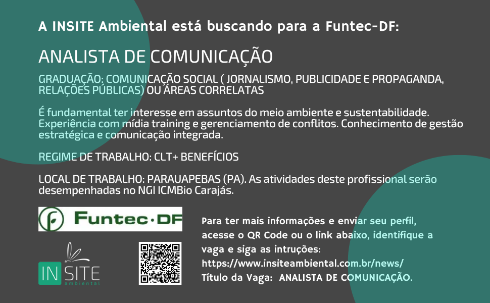 12 de Janeiro de 2024. A INSITE Ambiental está buscando para a FUNTEC-DF: ASSISTENTE DE COMUNICAÇÃO. GRADUAÇÃO: Marketing, Publicidade e Propaganda ou áreas correlatas. ESSENCIAL PARA A VAGA: É fundamental ter interesse em assuntos que tratam do meio ambiente e sustentabilidade. É importante ter vivência com mídias digitais, fazer entregas criativas e agir com proatividade. QUALIFICAÇÕES…